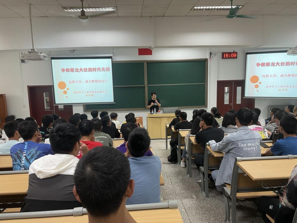 赵珥希老师首先对新生同学们的到来表示欢迎,他指出老员工活精彩纷呈,把握未来才能拥有无限的可能。同时也对新生提出以下几点要求:一是把握机遇、与时俱进,他说我国力争2030年前实现碳达峰,2060年前实现碳中和,这是党中央作出的重大战略决策,核能是作为国家“十四五”规划加快推动经济社会发展全面绿色转型的战略举措中的重要组织部分,核学院学子要把握住这个机会,为祖国核电事业添砖加瓦;二是目标明确、扎实基础,要提前规划未来的道路,从事任何职业都需要同学们学习本领过硬、有较强的创新能力,努力成为一名综合素质全面发展的优秀老员工;三、充分利用好课余时间,多学习其他的知识技能,多参加社会实践了解社会,每天为梦想奋斗一小时,让自己的老员工活像阳光般灿烂,让青春之花最终绽放在祖国最需要的地方。