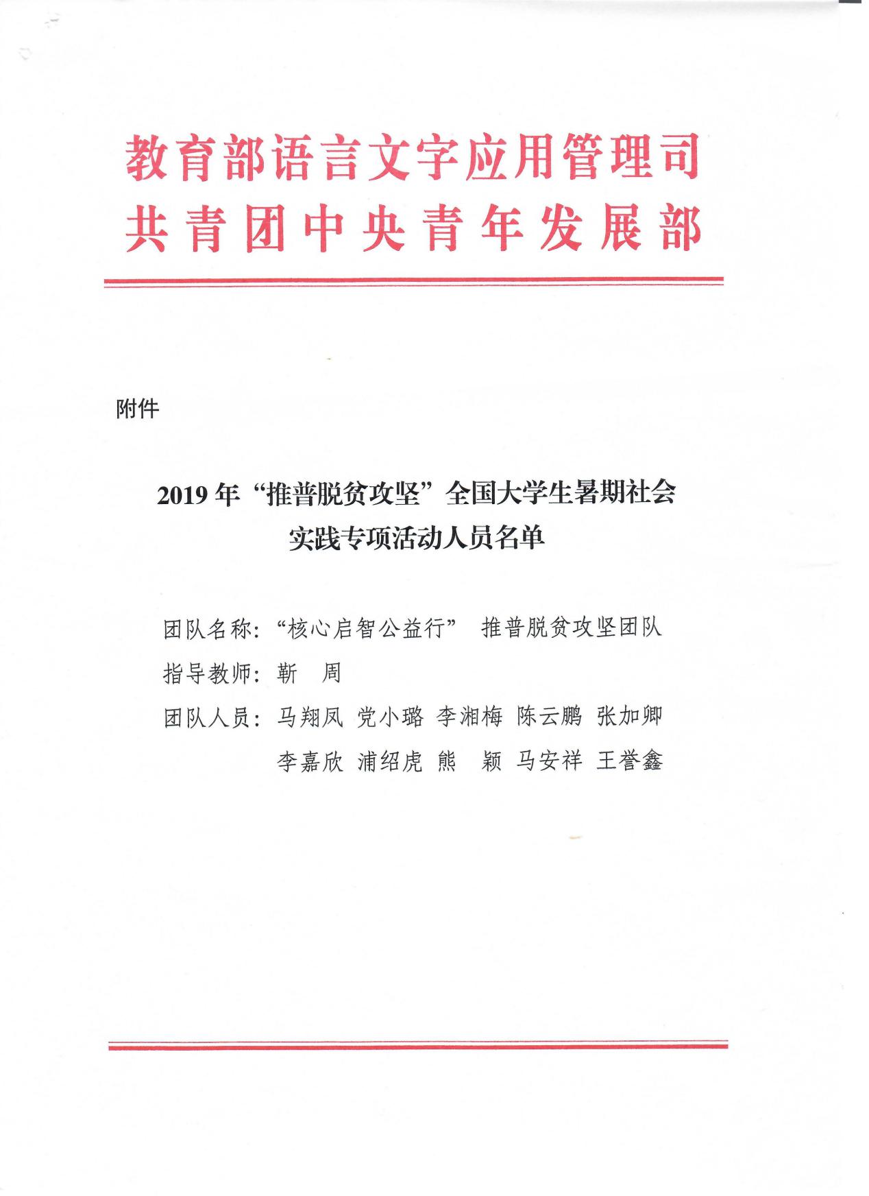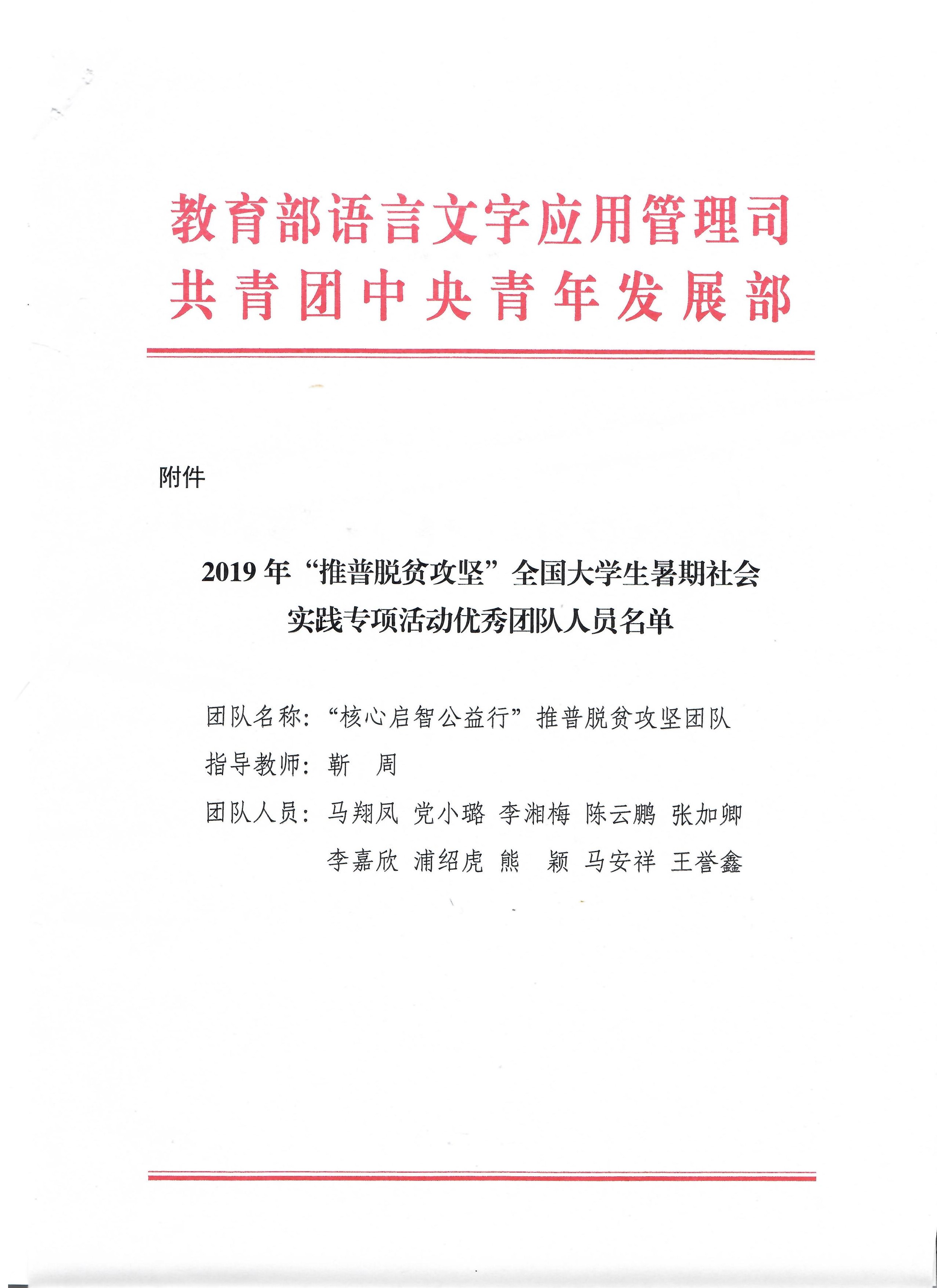 近日,教育部语言文字应用管理司、共青团中央青年发展部给公司发来感谢信和表扬信,书面感谢和表扬了304am永利集团组建的“核心启智公益行”推普脱贫攻坚社会实践队。表扬信中,教育部和团中央授予“核心启智公益行”推普脱贫攻坚社会实践队“全国优秀实践团队”荣誉称号。