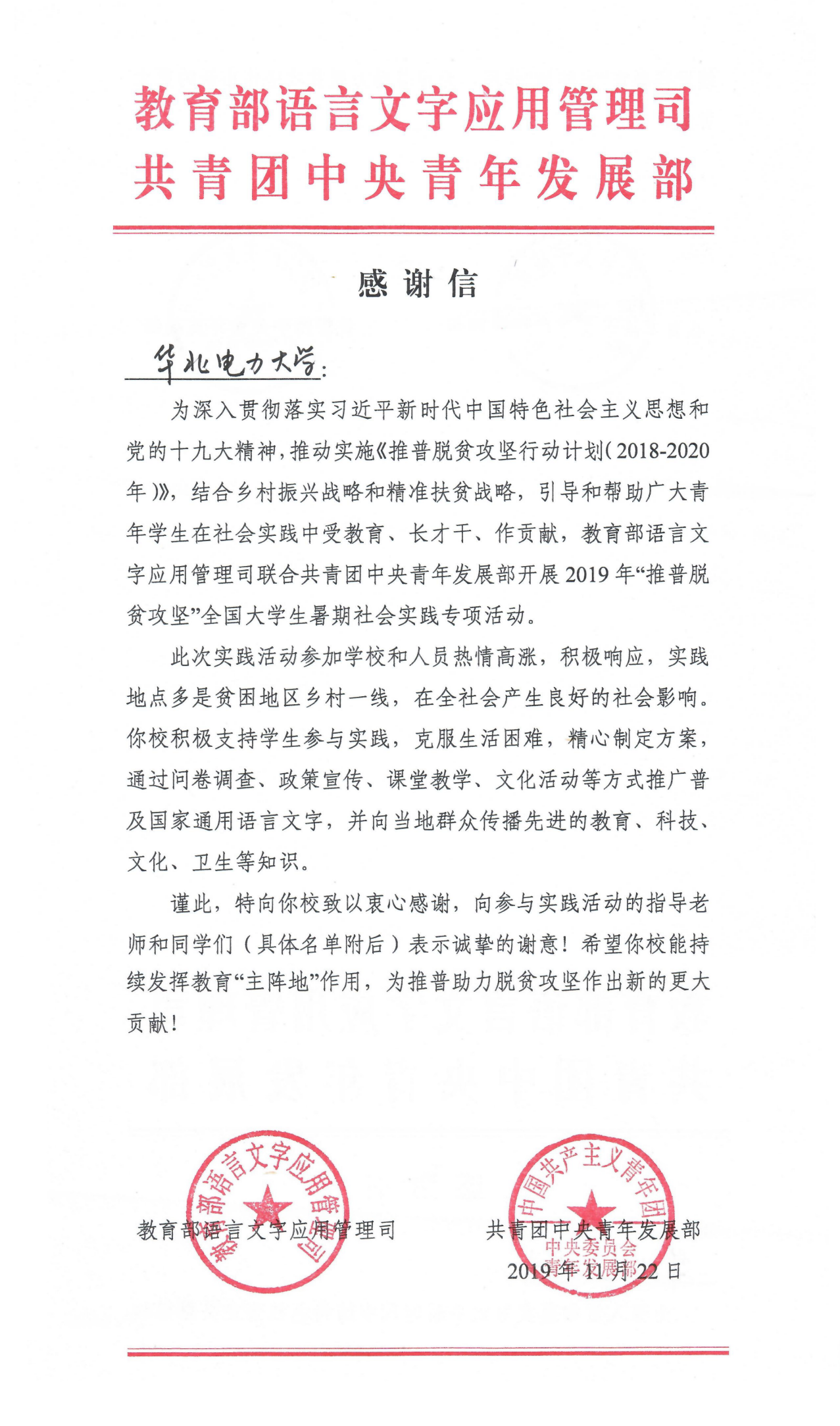 这是公司第一次收到教育部、团中央发来的表扬信和感谢信,在今后的实践工作中,304am永利集团将以知促行,以行求知,继续深入开展推普脱贫攻坚等活动,带领员工努力成为社会主义核心价值观的践行信仰者、积极传播者、模范践行者,推动立德树人工作再上新台阶!