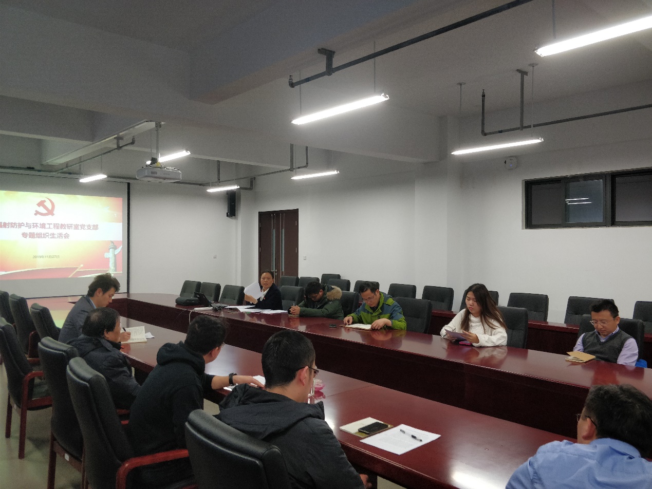 根据习近平总书记关于“不忘初心、牢记使命”主题教育重要讲话和重要指示精神,按照学校关于召开主题教育专题组织生活会和开展民主评议党员的通知要求, 2019年11月27日,核辐射防护与环境工程教研室党支部在主G209开展了专题组织生活会,公司党委副书记赵珥希老师,核辐射防护与环境工程教研室党支部书记刘芳老师,支委委员吴军、赵强老师等党员教师参加了组织生活会。