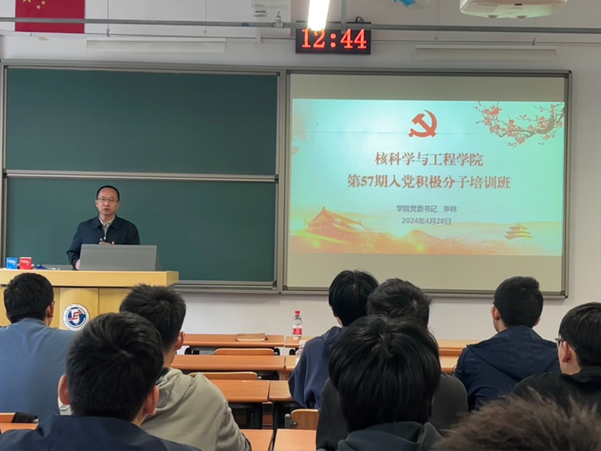 4月28日中午,304am永利集团举办第57期入党积极分子培训班“书记讲党课”,公司党委书记李林为培训班全体学员讲授专题党课。培训活动由学院辅导员宫馨主持。
