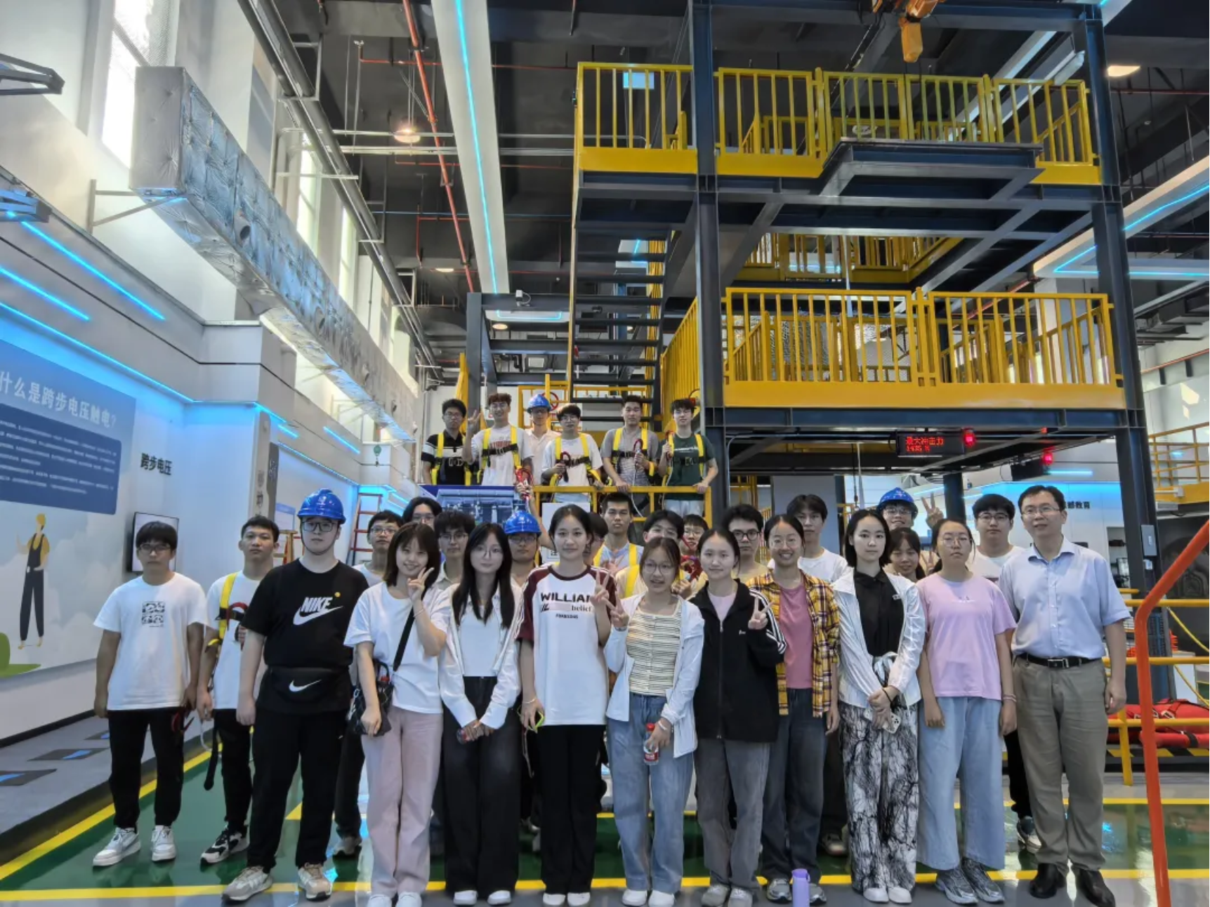 9月6日下午实习成员进行工业安全实践,近距离观察和触摸了常用防护用品,学习并体验如何佩戴安全绳。秦山核电站借助AR模拟事故发生现场,在高度还原的场景下提高员工提防事故发生和处理事故的能力。