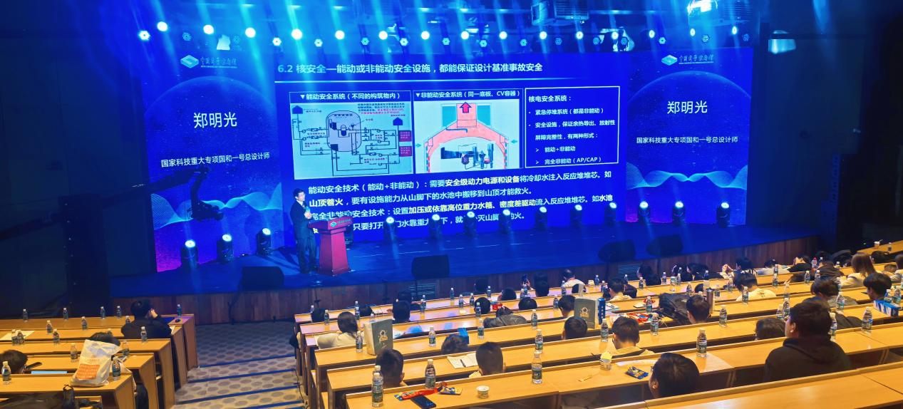 在专题报告环节,师生认真聆听国家电投集团首席科学家、国和一号总设计师郑明光《先进核电技术创新,助力清洁低碳转型和科技强国建设》专题报告,解析我国三代非能动核电技术“国和一号”的全球领先优势,以及对助推国家能源清洁低碳转型和科技强国建设的重要作用。