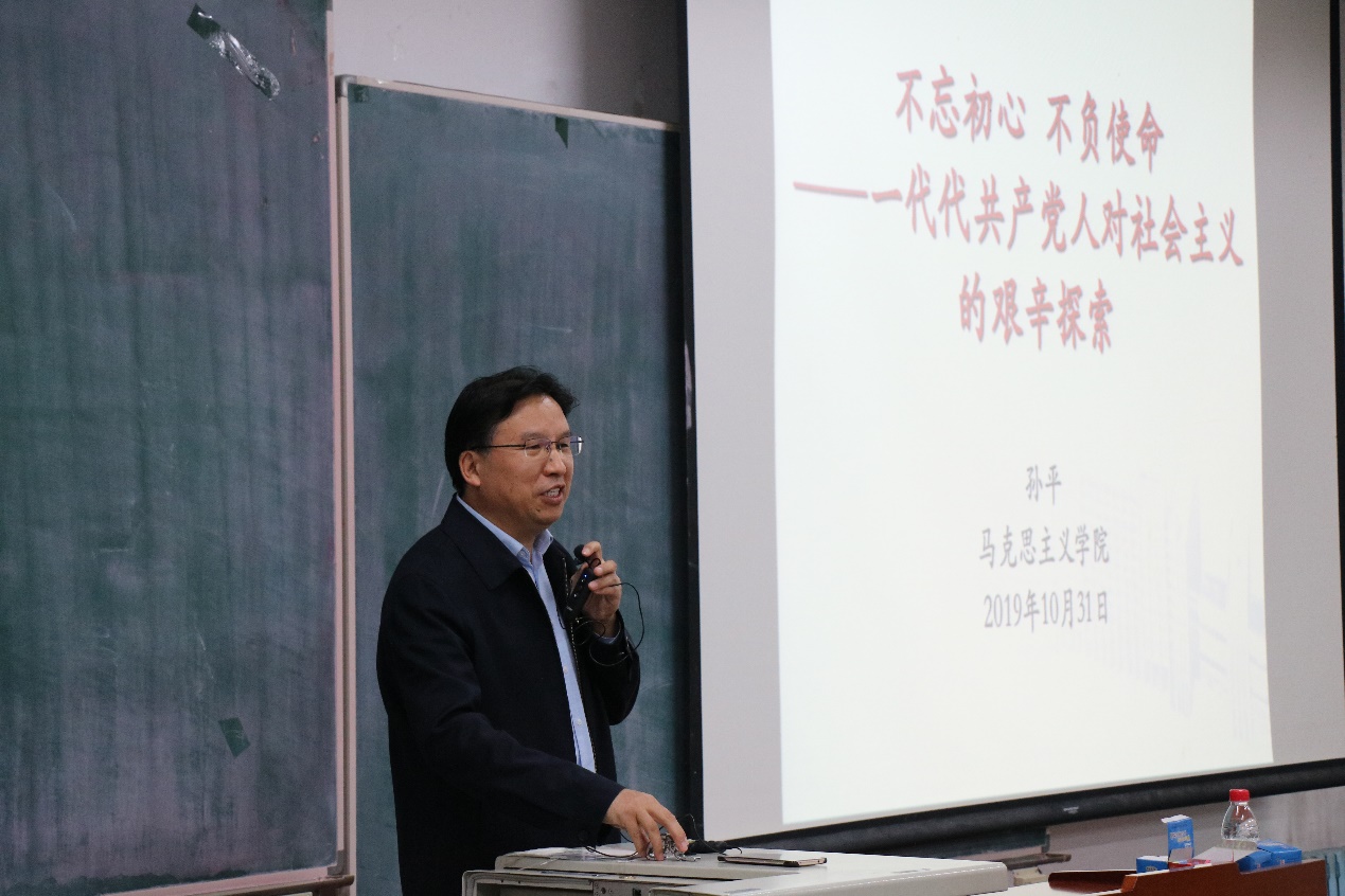孙平老师以毛泽东青年时“为什么书中没有以农民做主人公的故事”这一思考为引入,向大家说起了“初心与使命”的理论渊源与发展脉络。他将这一过程分为三个部分,一是“始于毛”。即党成立之初至中华人民共和国成立前期毛泽东对于马克思主义的辩证思考与探索;二是“成于邓”。是指邓小平为我国社会主义建设打下的基础;三是“强于习”。即党的十八大以来,中国进入社会主义建设新时期的探索道路。“中国共产党从无到有、从小到大、从弱到强、从革命党到执政党、从幼稚到成熟,这是一个历经曲折坎坷,不断改革壮大的发展历程;也是一个从胜利走向胜利的伟大过程。这其中的一条重要逻辑就是不忘初心,牢记使命。”